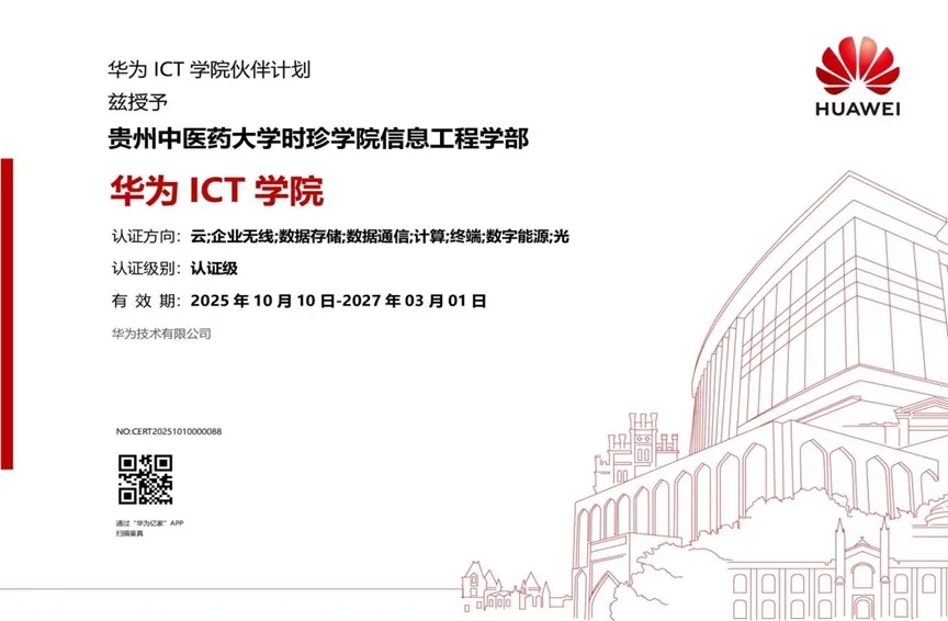 近日,贵州中医药大学时珍学院信息工程学部正式获批认证级华为ICT学院,这标志着我校在产教融合、校企合作方面迈上了新台阶,为培养高素质医工交叉信息技术人才奠定了坚实基础。