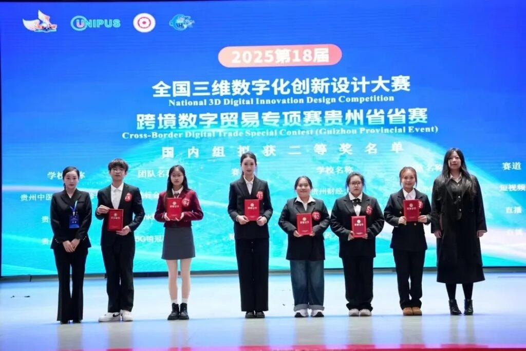 最终,经过多轮激烈角逐,由向流心悦、向登菊老师指导的“芝行合一” 队与向流心悦、刘光军老师指导的“‘袋’货超人” 队双双斩获二等奖,由邱嫒雯、车鑫老师指导的“黔乡新苗远征” 队凭借亮眼表现荣获优秀奖!三支队伍的优异成绩,不仅是同学们专业能力与实践素养的生动体现,更彰显了我校在跨境数字贸易、三维数字化设计等相关专业领域的教学成果与育人实力,为学校赢得荣誉。