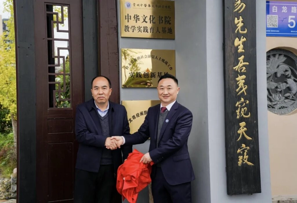 胡绍波与谌业军共同为“贵州中医药大学时珍学院中华文化书院教学实践育人基地”揭牌。