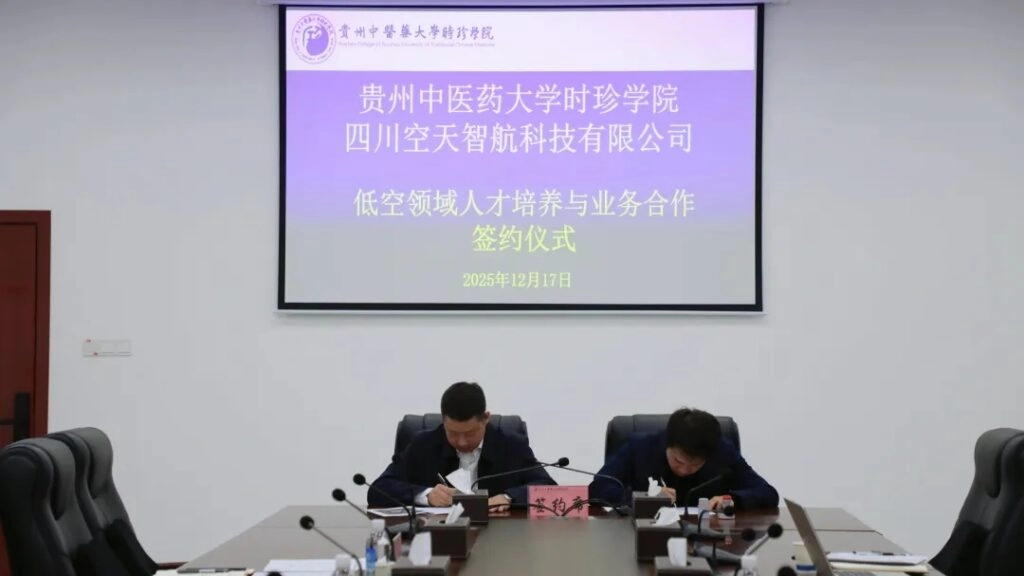 2025年12月17日下午,贵州中医药大学时珍学院与四川空天智航科技有限公司就低空领域人才培养与业务合作签约仪式在学校图书馆612会议室成功举行。学校党委委员、常务副院长梅国海,副院长肖义虎、信息工程学部院长张俊、副部长唐酸、四川空天智航科技有限公司总经理刘哲瑞、副总经理杨昊锦出席签约仪式。仪式由张俊主持。