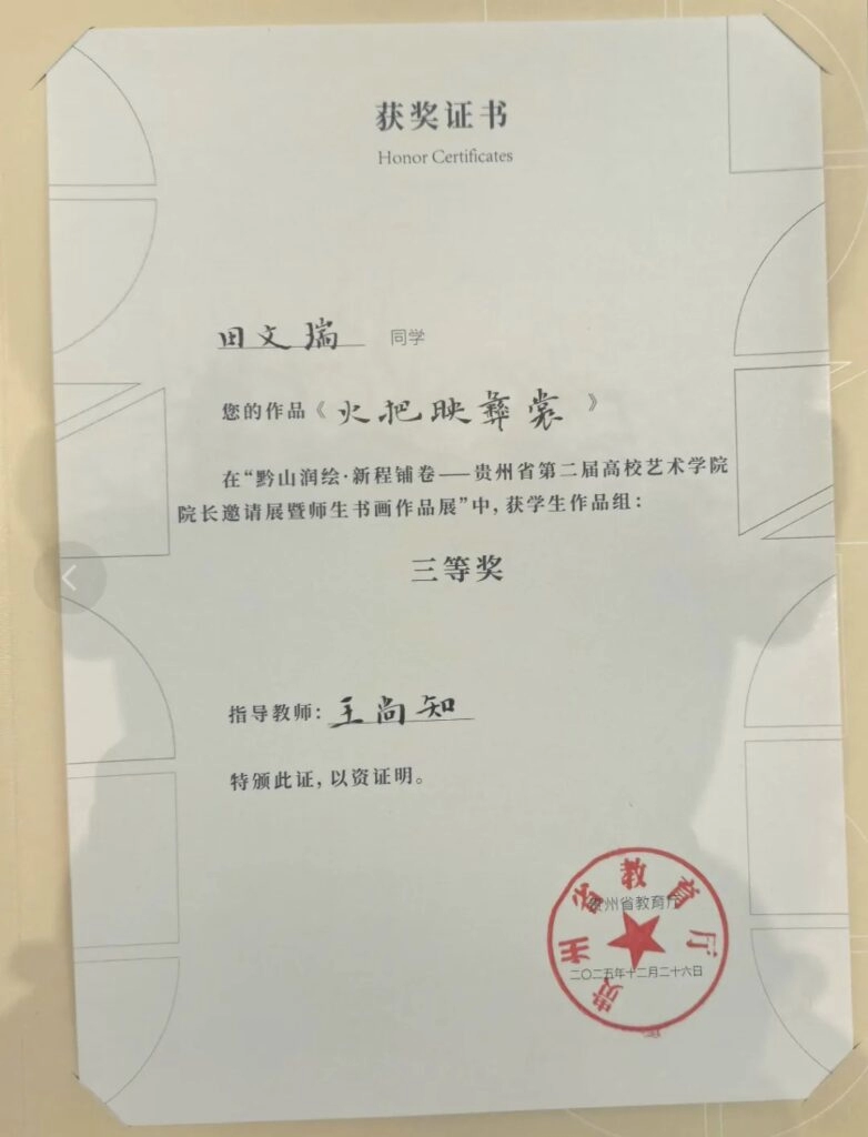 近日,贵州省教育厅公布第二届高校艺术院长邀请展及师生书画作品展获奖结果,我校学子田文瑞的作品《火把映彝裳》在全省837件参展作品中脱颖而出,历经专家初评、复评的严格遴选,最终荣获学生绘画组三等奖。