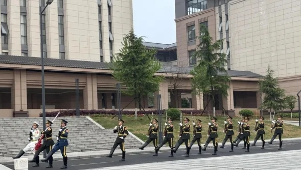 仪式伊始,迎国旗环节庄严肃穆。国旗护卫队步伐整齐划一、英姿飒爽,护卫着鲜艳的五星红旗,踏着有力的正步,护送国旗走向升旗台。他们坚定的眼神、标准的动作,展现出对国旗的无限敬意,也让在场师生沉浸在庄重肃穆的氛围之中。