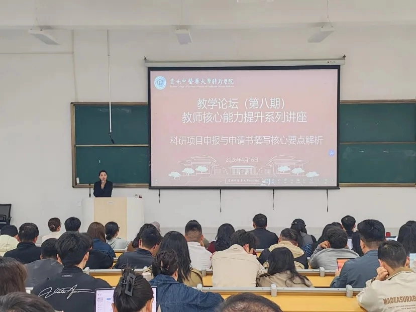以高水平科研反哺高质量人才培养,推动科研与教学协同育人,助力学校内涵式发展,2026年4月16日下午,学校在崇德楼112室开展教学论坛教师核心能力提升系列讲座第八期,医药学部专业带头人张永萍教授作《科研项目申报与申请书撰写核心要点解析》专题讲座。学校副校长白宗新、教务处处长朱耀乾、医药学部副院长罗亚非、健管学部副院长多俊岗及全校专任教师参加,讲座由教务处副处长姚晓艳主持。