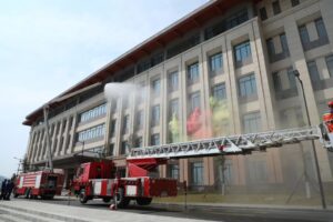 随着警报声响起,演练开始。此次演练是模拟2号教学楼3楼发生电器起火处置。保卫处巡逻人员发现后立即按下手动按钮,并呼叫监控值班室,各单位在第一时间实施救援措施。按照预先制定的应急预案,上课教师、辅导员立即组织教室内学生弯腰、低姿、捂鼻紧急撤离,迅速有序的到达安全地点。消防、医护力量迅速对现场实施布控、救援、转移伤员。