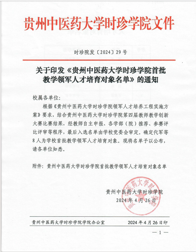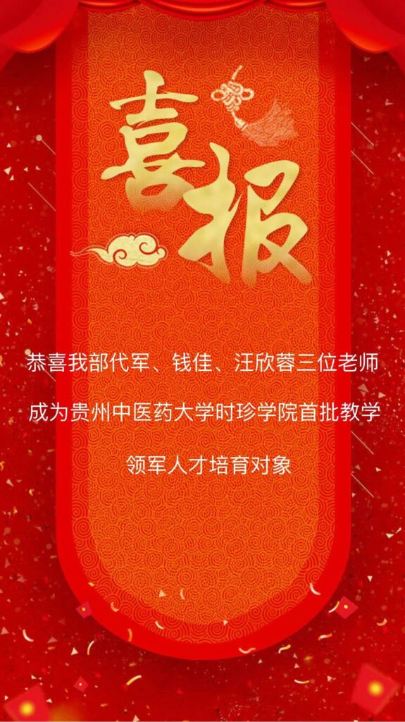 【喜报】关于我部代军等老师成为贵州中医药大学时珍学院首批教学领军人才培育对象