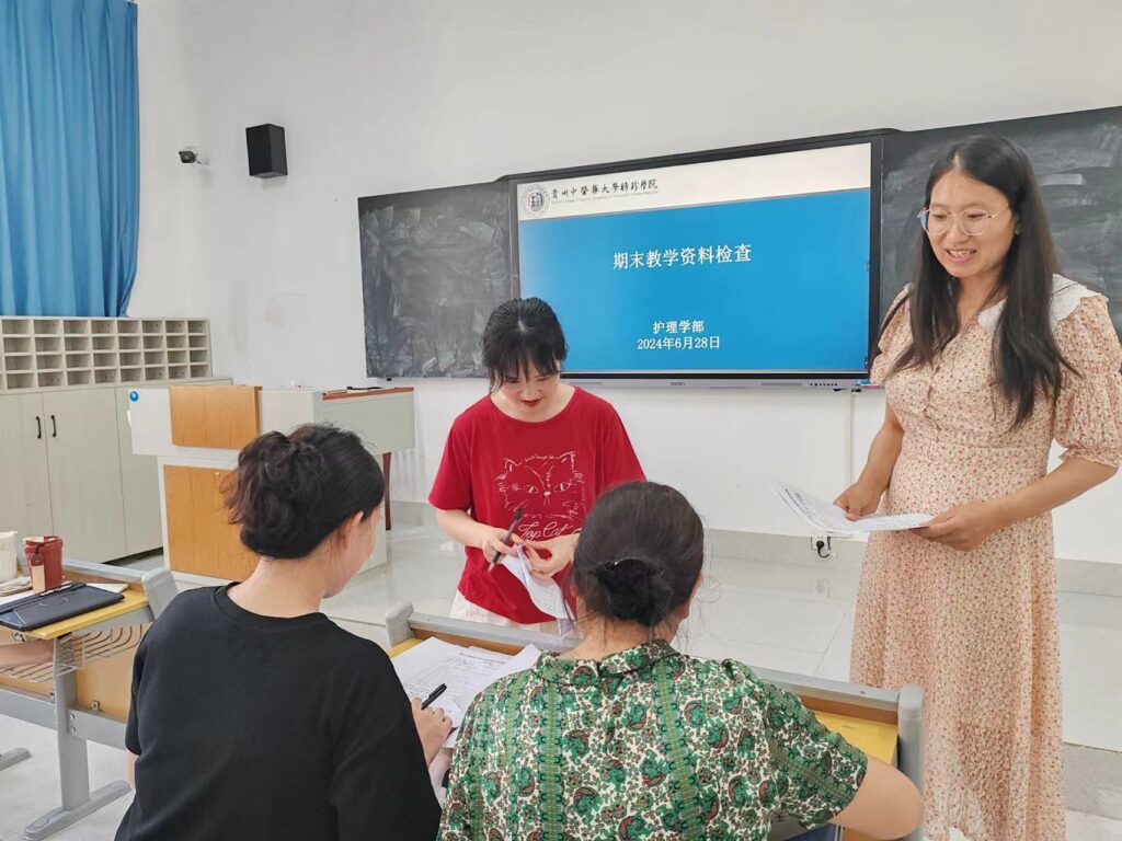为了进一步提高教育教学质量,规范教师教学行为。按照《贵州中医药大学时珍学院课程教学大纲管理办法》《贵州中医药大学时珍学院教学设计与实施方案》《贵州中医药大学时珍学院教学进度表》《贵州中医药大学时珍学院关于2023-2024学年第二学期上交教学相关材料的通知》等文件要求,护理学部开展了对期末教学资料的全面检查,确保教学资料的完整性和规范性。