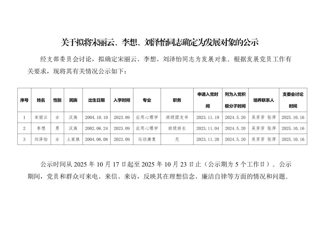 关于拟将宋丽云、李想、刘泽怡同志确定为发展对象的公示