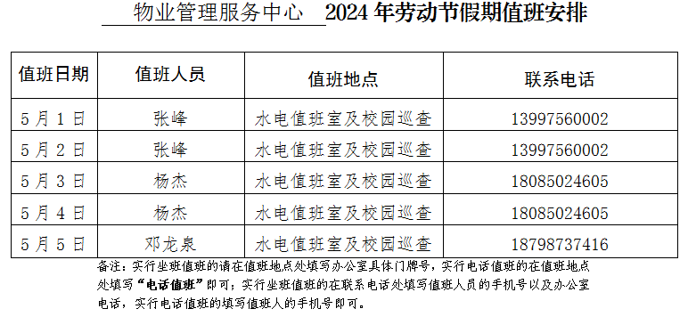 随着五一假期的临近,为了确保学院正常运行及师生生活不受影响,将安排值班人员负责处理紧急事务。以下是值班安排及相关事项: