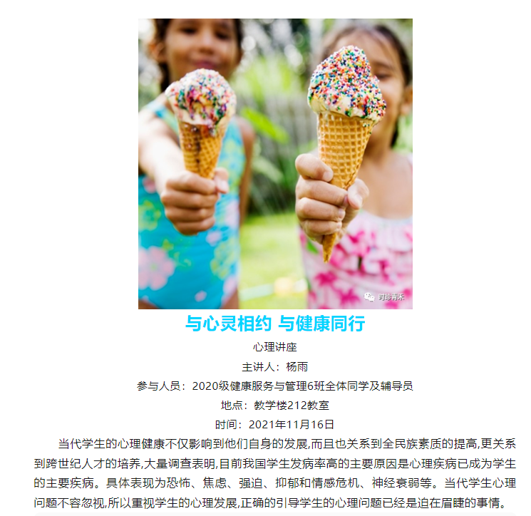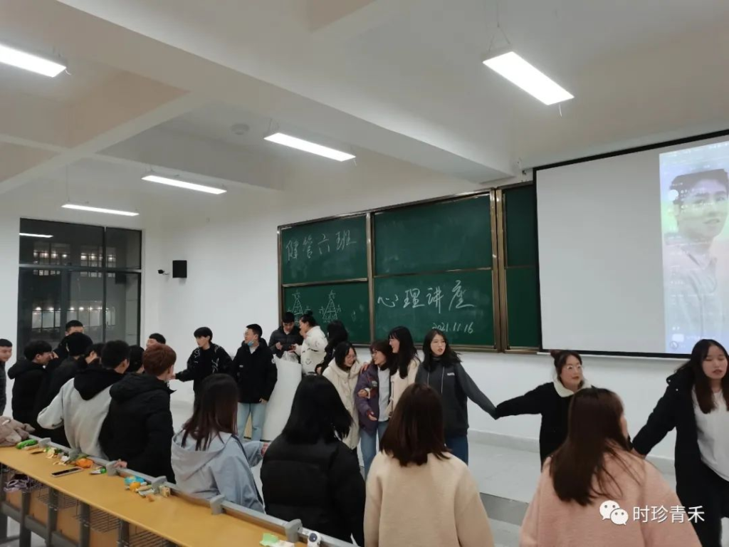 为了让同学们拥有更好的心理健康,能够更好的适应大学生活,能够在人际交往方面能有更好的认识,特此举办了这次心理健康讲座,来告诉我们什么样的心理才算是学生应有的心理,以及什么样的心理才算真正的健康心理。此次活动的内容包括:1.心理知识及疾病普及;2.我们如何自我疗愈3.数字心理学 (邀请几位同学进行了测试);4.全班一起玩游戏;5.一起合唱;6.拍大合照。