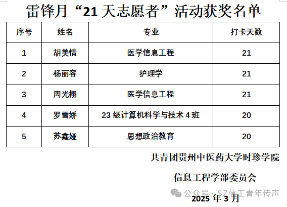 3月6日至3月26日,“21天养成计划·志愿达人”活动圆满收官。在为期21天的志愿服务实践中,众多志愿者积极参与,最终获奖名单正式公布: