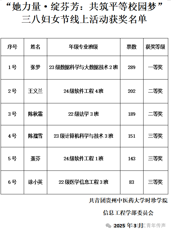 3月7日,“她力量·绽芳华:共筑平等校园梦”三八妇女节活动成功举行。活动围绕展现女性风采、倡导平等理念展开,获奖名单的公布,为活动画上圆满句号。