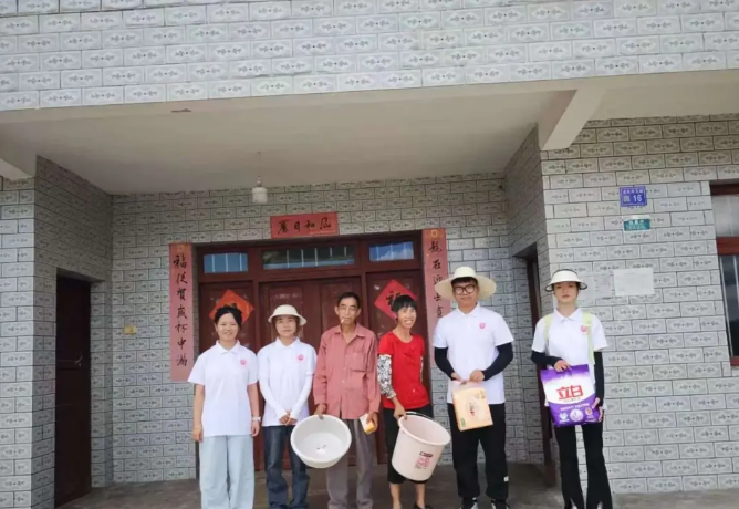 团队成员每到一户,将洗衣粉、盆、桶等生活日用品递到老乡手中,家常里短的交流拉近心的距离,听他们讲述生活不易,也以笑容回应、给予力量。