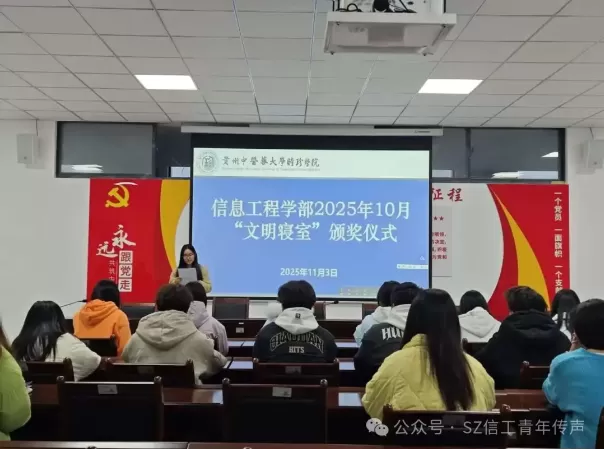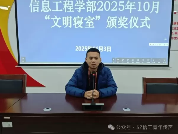 为深入推进校园文明建设,营造整洁有序、温馨和谐的寝室生活环境,增强同学们的集体归属感与责任感,信息工程学部于2025年11月3日下午,在笃行楼309举行优秀文明寝室表彰仪式,会议由万钰湘主持,学部副部长唐酸、学工办主任马金念、团委负责人陆付婷参加本次表彰仪式。