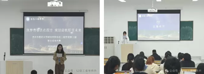 为引导学生进一步增强职业规划意识,明确职业发展方向,充分发挥“以赛促学、以赛促教、以赛促就”的积极作用。2025年11月6日,贵州中医药大学时珍学院信息工程学部以“筑梦青春志在四方,规划启航职引未来”为主题,举办了第三届全国大学生职业规划大赛学部选拔赛。此次比赛按照赛制分为“成长赛道”和“就业赛道”。比赛由王颢洁、黄奕两位同学主持。