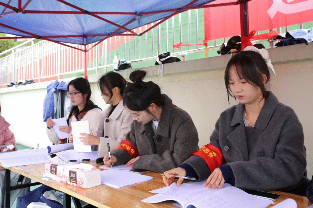 赛前筹备阶段,志愿者们是忙碌的 “先行者”。在党支部统一组织下,大家迅速分工、有条不紊地投入准备工作,红色身影穿梭于运动场各个角落,以 “不怕苦、不怕累” 的奉献精神,为运动会顺利开展奠定坚实基础。