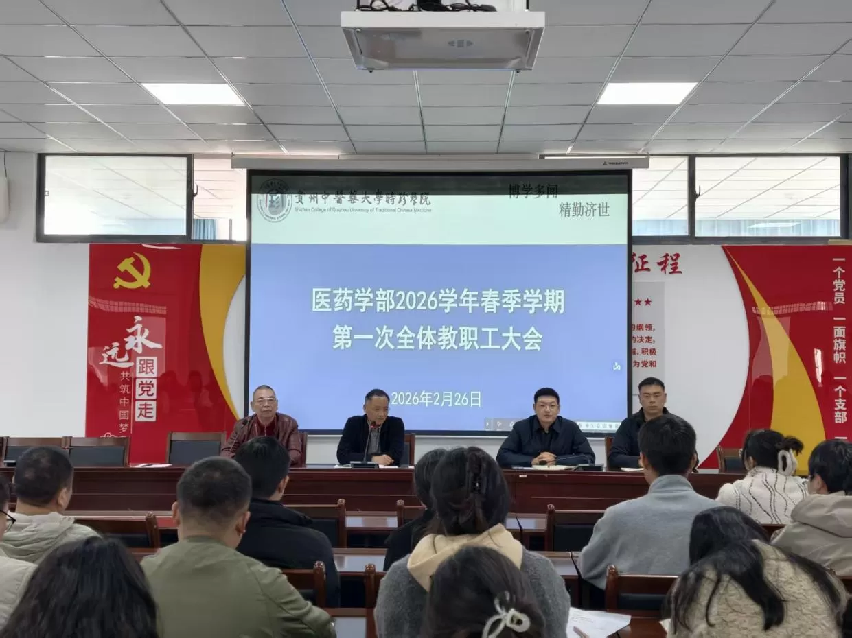 2026年2月26日下午,医药学部2026学年春季学期第一次全体教职工大会在实训楼3楼会议室顺利召开。学校党委委员、副院长白宗新,教务处处长、医药学部院长朱耀乾,医药学部副院长罗亚非、副部长杨洪浩及学部全体教职工参加会议。会议由朱耀乾主持。